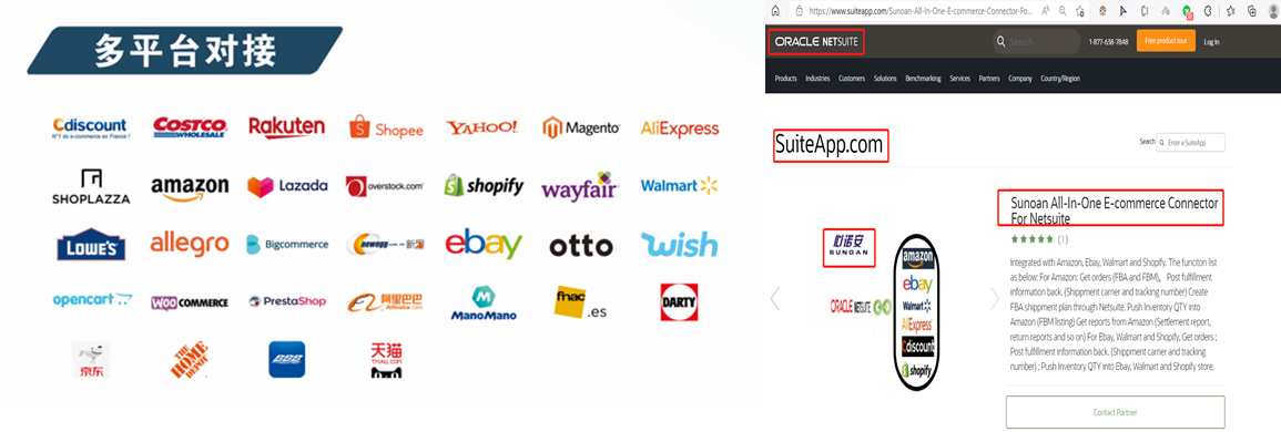 心诺安是行业内首家打通电商平台多达50几家的实施商,包括WayfairHome depot 以及Low’s等通过EDI的平台全流程对接,其它暂未接通的,只要对方提供接口,我们都可以在短时间内接通,同时我们还专门开发了AIO Connector ,在甲骨文官方商城应用商店可单独售卖。